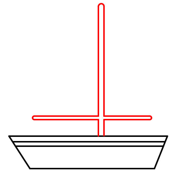 Krok 3: Ze středu horní hrany lodi nakreslete svislou čáru směrem nahoru. Těsně nad trupem přidejte vodorovnou čáru, která tuto svislou protne. Tím vznikne stěžeň a základna pro plachty.