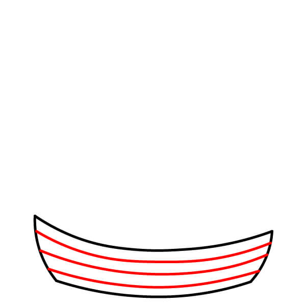 Krok 1: Nakreslete zakřivenou čáru pro horní okraj trupu lodi. Pod ni nakreslete další zakřivenou čáru pro spodní část trupu a na obou koncích je spojte dvěma svislými nebo mírně šikmými čarami.