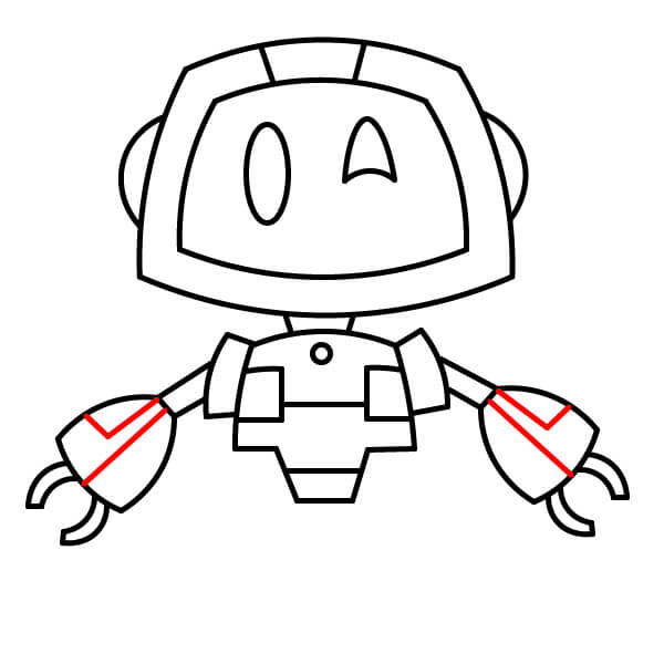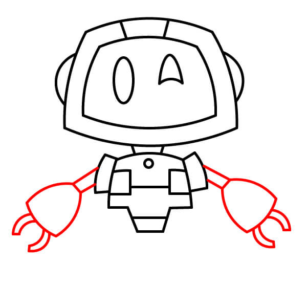 Z ramenních kloubů nakreslete tenké spojovací části paží. Na jejich konci nakreslete velké zaoblené klepetové ruce. Každá ruka má dole dva zakřivené špičaté výběžky.