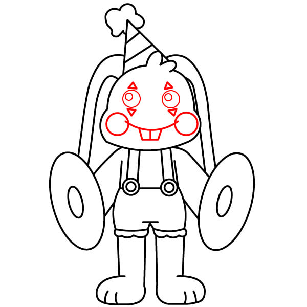 Nakreslete dva kruhy pro bělmo očí. Do každého přidejte menší kruh jako zornici. Nad každé oko nakreslete dva malé trojúhelníkové tvary. Po stranách spodní části obličeje nakreslete dva velké kruhy jako tváře. Nakreslete širokou zakřivenou čáru spojující tváře a pod ní přidejte dva čtvercové králičí zuby. Nad ústy nakreslete malou zaoblenou čáru spojující tváře.
