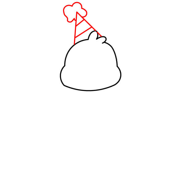Nakreslete kuželovitý tvar na vrch hlavy jako párty čepici. Uvnitř kužele přidejte několik šikmých čar pro detaily. Na samotný vrchol kužele nakreslete shluknutý tvar podobný obláčku pro bambuli.