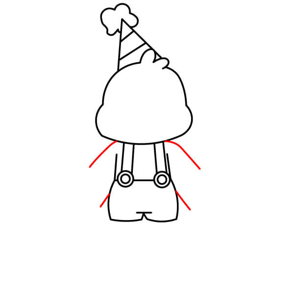 Nakreslete dvě krátké šikmé čáry směřující ven ze stran šortek (tam, kde by byl trup) jako začátek rukou. Také nakreslete dvě krátké šikmé čáry spojující šortky s obrysem trupu vytvořeným v kroku 4.