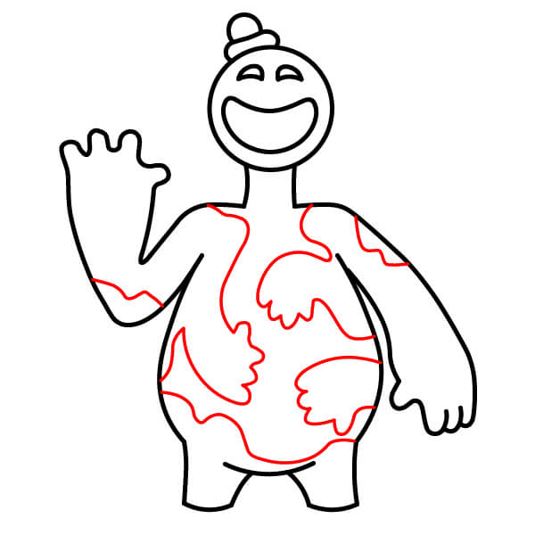 Nakreslete několik velkých, vlnitých a nepravidelných tvarů uvnitř těla a paží. Tyto čáry vyznačují různé barevné „těstové“ části Doeyho těla.