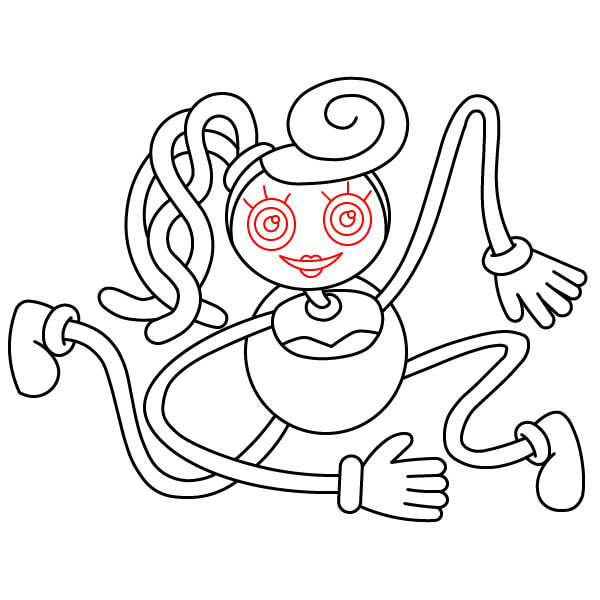Uvnitř hlavy nakreslete dva velké kruhy pro oči. Do nich přidejte menší soustředné kruhy pro zorničky a další detail kolem očí, aby měly typický velký, panenkový vzhled. Nakonec nakreslete malá usměvavá ústa s rty.