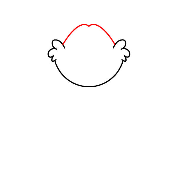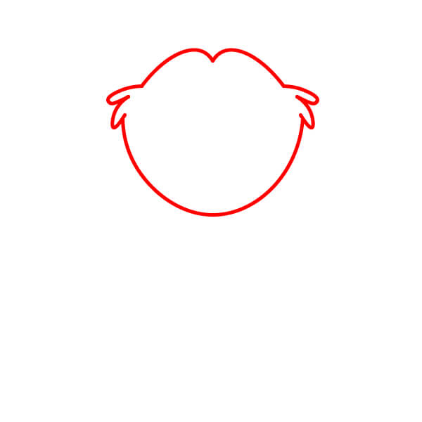 Začněte nakreslením základního obrysu hlavy. Měla by mít velký, zaoblený tvar s mírným prohnutím ve tvaru „M“ nebo zakřiveným zářezem nahoře a malými chomáčky srsti po stranách.