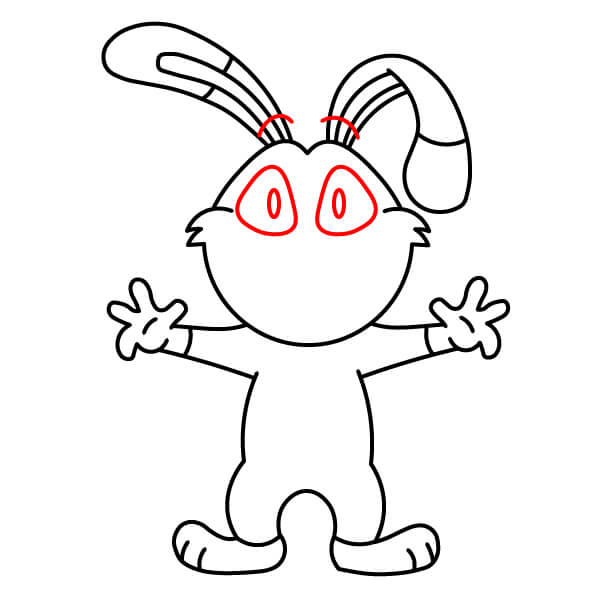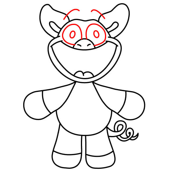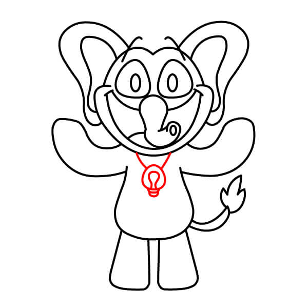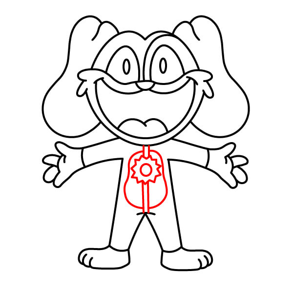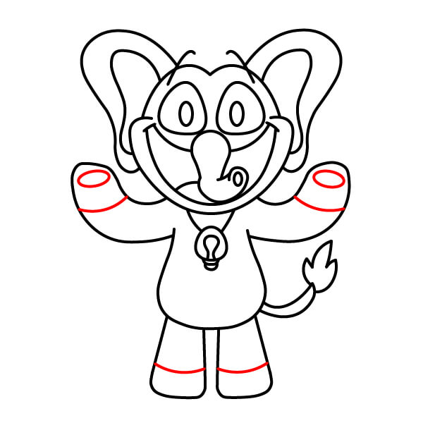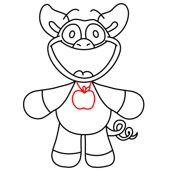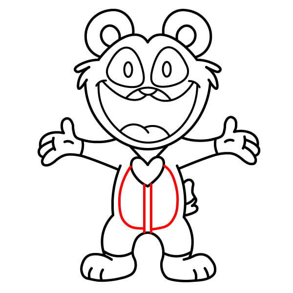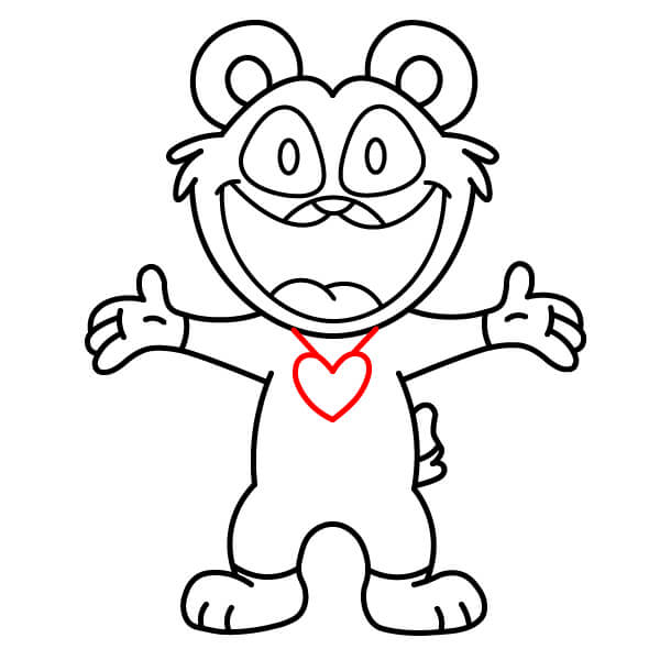 Teď je čas na vybarvení! Vybarvěte hlavní tělo, hlavu, uši a paže červeně. Oči vyplňte černě. Vnitřek úst vybarvěte tmavě růžově nebo červeně, břišní panel a špičky rukou a nohou světle růžově, přívěsek ve tvaru srdce na hrudi tmavě červeně nebo kaštanově.