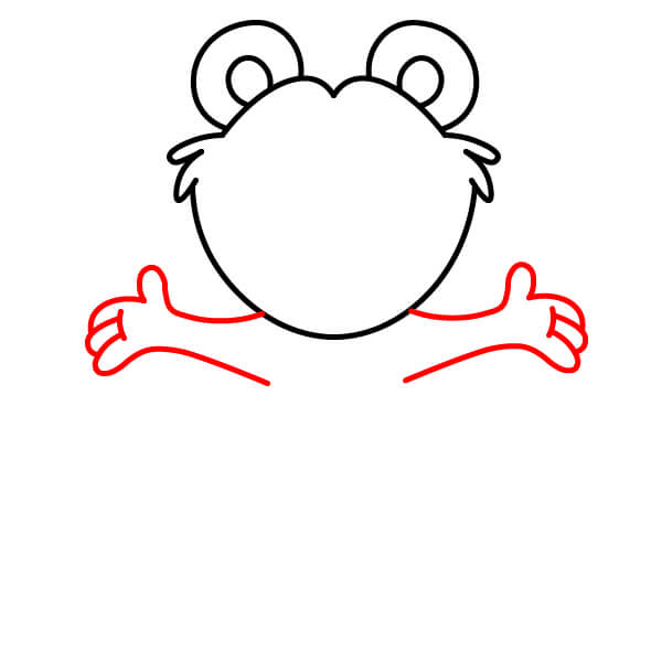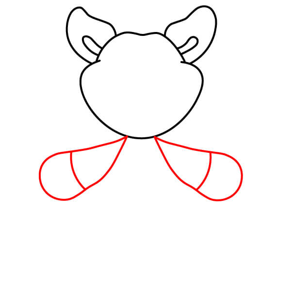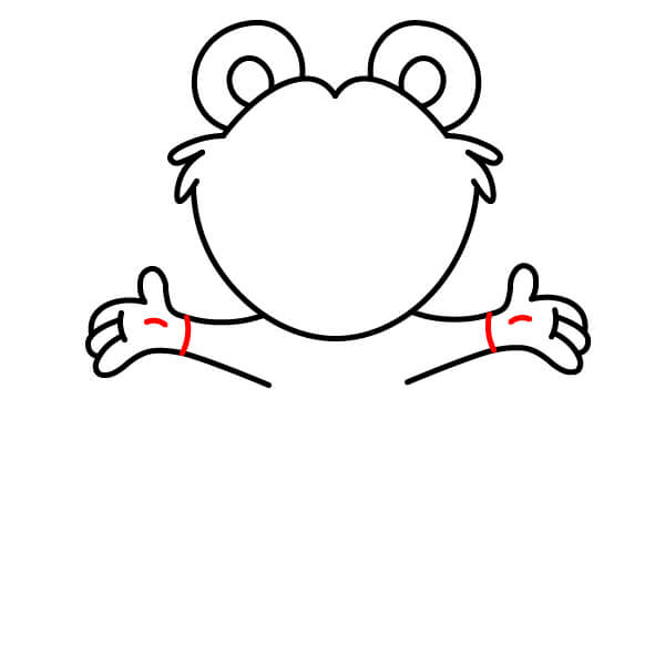 Nakreslete horní části paží. Veďte dvě zakřivené čáry dolů z oblasti hlavy/krku a na koncích přidejte zaoblené tvary pro ruce/tlapky. Přidejte čáru přes každý zaoblený konec, aby tlapky vypadaly jako palčáky.
