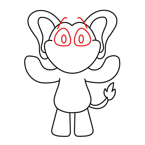 Přidejte oči a obočí. Nakreslete dva velké, výrazné kruhy pro oči těsně nad nosem/čenichem. Dovnitř přidejte menší kruhy pro zorničky. Nad oči nakreslete dvě malé zakřivené čárky jako obočí.