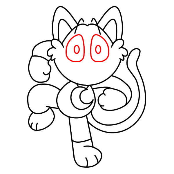 Přidejte oči a chloupky nad očima. Uvnitř hlavy nakreslete dva velké ovály pro oči a nad ně přidejte několik krátkých, špičatých čárek pro srst/vlasy.