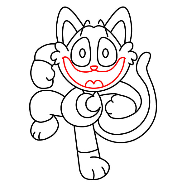 Nakreslete ústa a nos. Načrtněte velmi široký, otevřený úsměv. Nad otevřením úst přidejte jednoduchou zakřivenou čáru pro malý kočičí nos a také čáru pro jazyk/spodní ret.