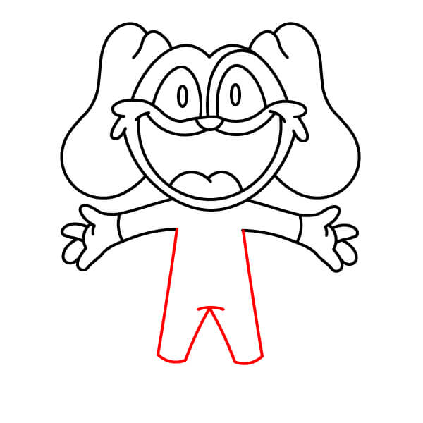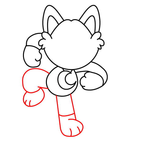 – Pravá noha (natažená): Nakreslete rovnou čáru pro nohu a dole přidejte zaoblenou tlapku s detaily prstů.