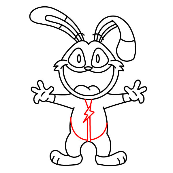 Přidejte přívěsek ve tvaru blesku a detail na hrudi. Nakreslete středovou čáru vedoucí dolů po těle a blízko horní části přidejte tvar blesku. Poté nakreslete dvě zakřivené čáry na spodní části trupu, které vymezí oblast břicha.