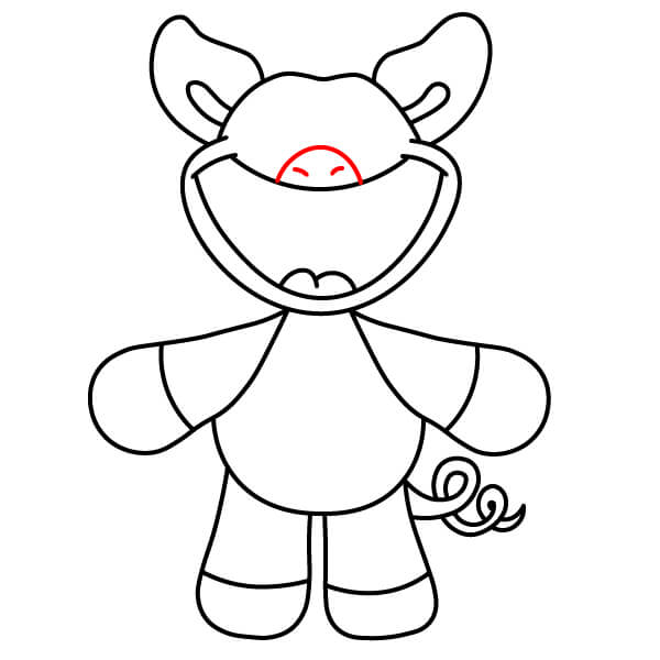 Vybarvěte hlavní tělo, hlavu a končetiny světle růžovou barvou. Tmavší růžovou použijte na vnitřek uší, čenich a špičky nohou a rukou. Oči a široce otevřená ústa vybarvěte černě. Malý jazyk/spodní ret a přívěsek ve tvaru jablka vybarvěte červeně.