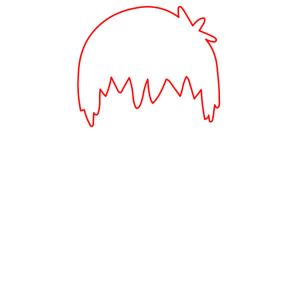 Začněte nakreslením velkého kruhu pro vlasy na temeni hlavy. Podél spodní strany vlasů přidejte zubatou nebo špičatou čáru, která vytvoří ofinu.