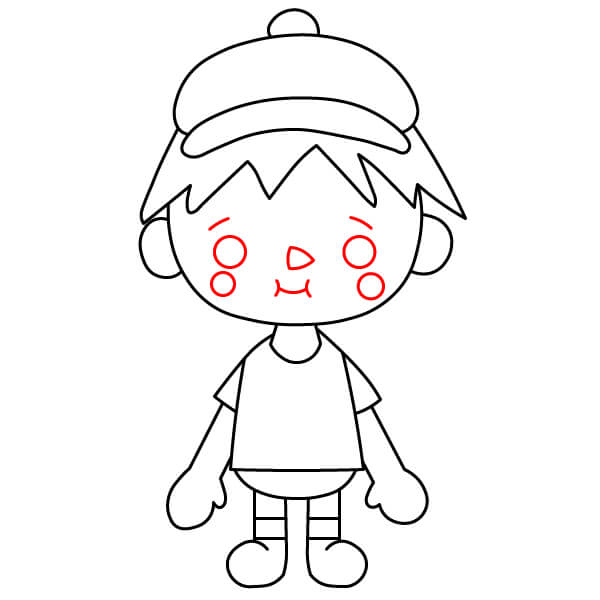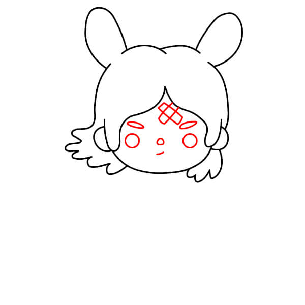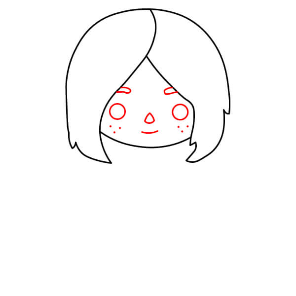 Nakreslete dva malé kruhy pro oči, malý trojúhelníkový nebo V-tvarovaný nos a křivku pro ústa, se dvěma malými kruhy na každé tváři, které představují ruměnec.