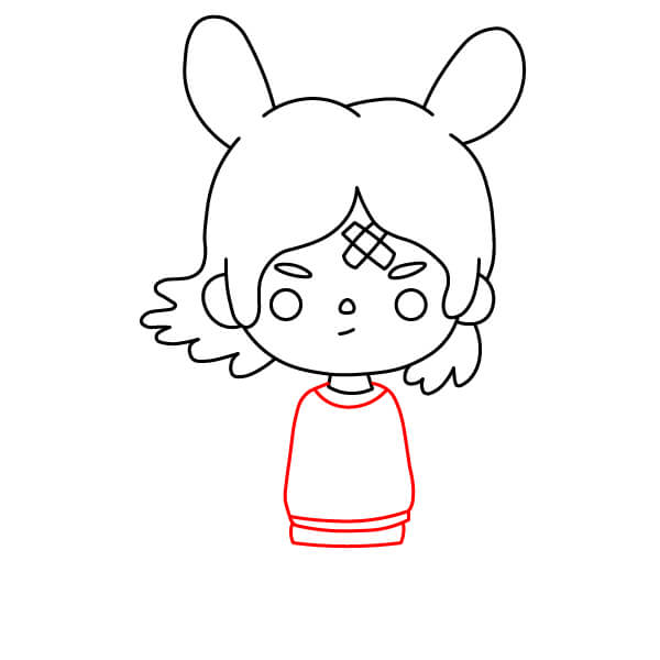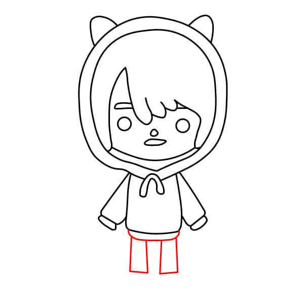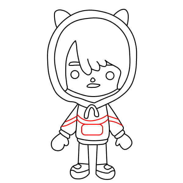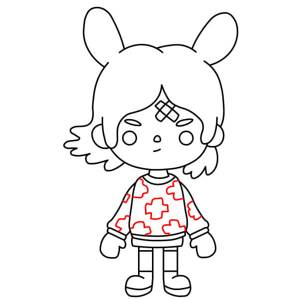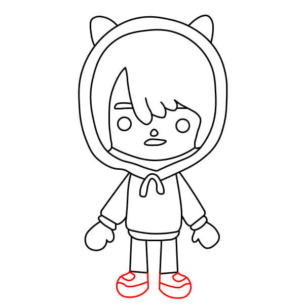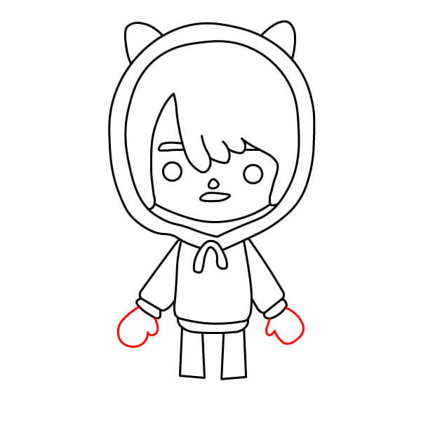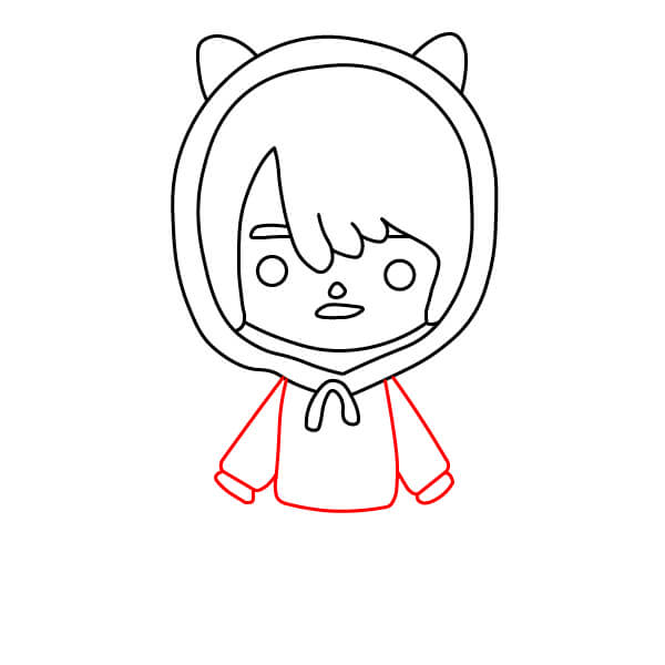 Nyní můžete začít vybarvovat postavu. Na vlasy použijte šedavě modrou barvu. Kůže by měla mít světle broskvovou nebo krémovou barvu. Mikina a kočičí uši mohou být jasně červené nebo růžové, přičemž vnitřní strana kapuce může být o něco tmavší. Stahovací šňůrka a kapsy na mikině mohou být světle modré. Kalhoty mohou být tmavě šedé a boty mohou být šedavě modré, aby ladily s barvou vlasů.