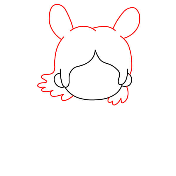 Zbývající vlasy nakreslete kolem obličeje a po obou stranách přidejte vlnité nebo klikaté čáry pro přirozený a nedbalý vzhled. Na horní část hlavy nakreslete dva velké kruhy pro králičí uši.