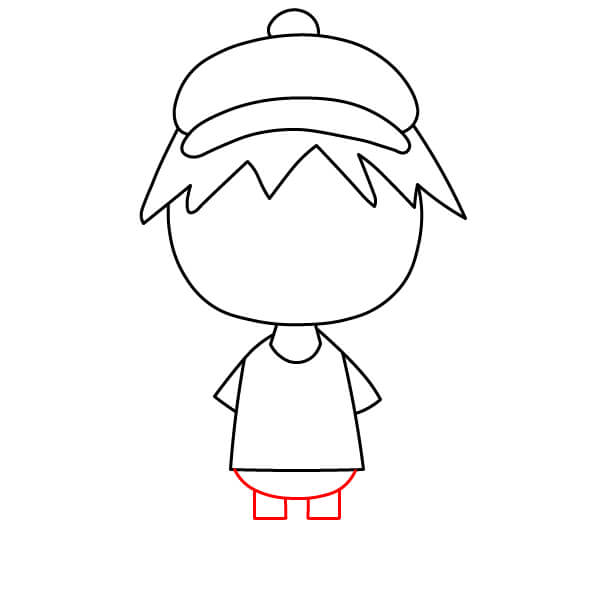 Nakreslete dvě krátké rovné čáry pro nohy. Ve spodní části každé nohavice přidejte kruh pro botu s jednoduchou svislou čarou uprostřed, která je oddělí.