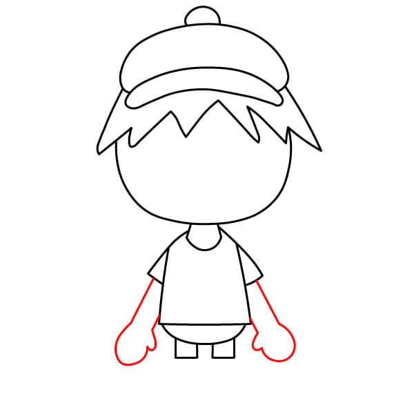 Z rukávů nakreslete dva zakřivené, zaoblené tvary pro paže a ruce. Ruce by měly vypadat jako pěsti nebo kulaté rukavice.