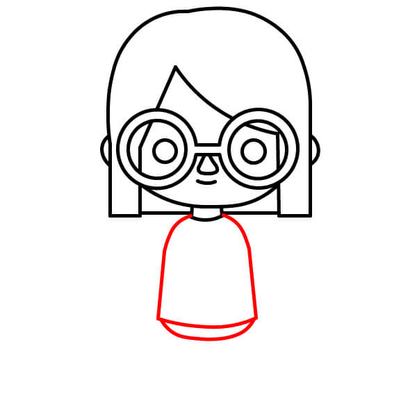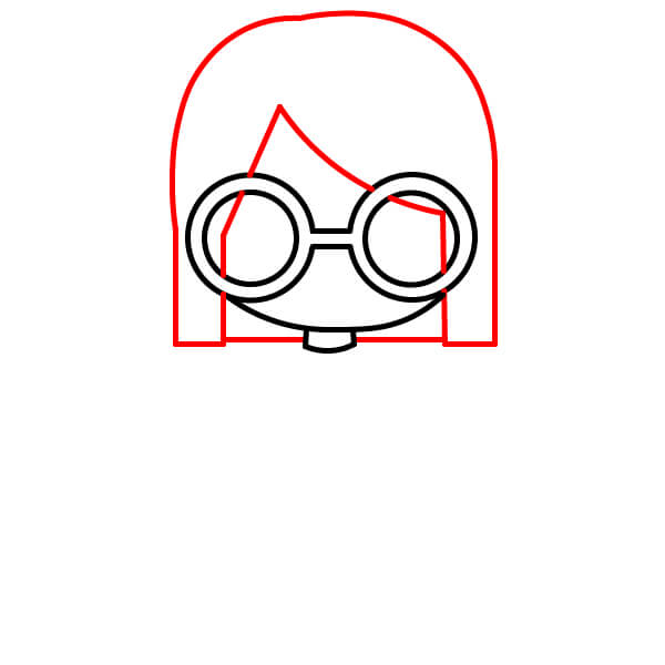 Nad obroučkami brýlí nakreslete velký, zaoblený oblouk, který tvoří horní část hlavy a vlasů. Poté nakreslete dvě svislé čáry z obou stran obrouček brýlí dolů, které se spojí s krkem a definují boky obličeje a konce účesu bob.