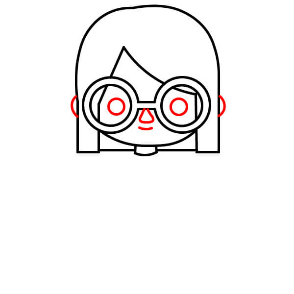 Uvnitř každé obroučky brýlí nakreslete menší kruh pro zornice. Mezi oběma obroučkami brýlí nakreslete malou křivku pro nos. Přidejte malé křivky po obou stranách vlasů, abyste nakreslili uši.