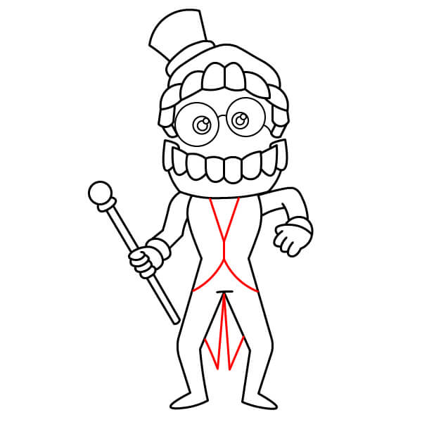 Doplňte poslední detaily Cainova těla, abyste evokovali jeho formální oděv. Nakreslete klopy a čáry na trupu, abyste vytvořili tvar vesty a saka. Pomocí rovných, hranatých čar vytvořte iluzi rozděleného ocasu v zadní části saka.