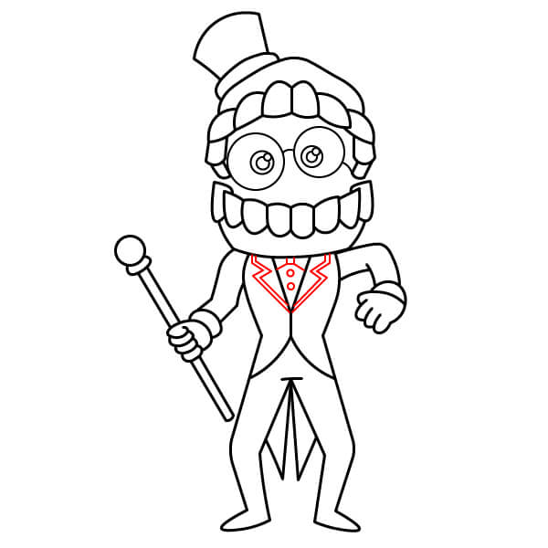 Uvnitř čar, které jste nakreslili pro klopy, přidejte malý motýlek u krku a svislé čáry pro vestu, čímž vytvoříte jasný tvar V podél trupu. Tyto detaily jsou na poskytnutém obrázku zobrazeny červeně.