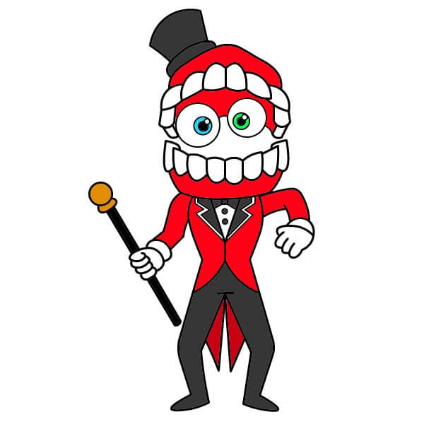 Chcete-li vybarvit Caina, začněte s jeho výraznými rysy: vybarvěte mu dásně/hlavu jasně červeně, ale zuby nechte jasně bílé. Jeho oči nejsou symetrické, proto vybarvěte pozadí jednoho oka jasně modře a druhého zeleně, brýle obvykle tmavě šedé nebo černé. Pro jeho formální oděv vybarvěte cylindr, kalhoty a hlavní část hole černě. Jeho oblek je kontrastně červený, zatímco vesta (ve tvaru V) a ruce v rukavicích jsou bílé. Nakonec vybarvěte kouli na vrcholu jeho hole zlatou nebo jasně žlutou.