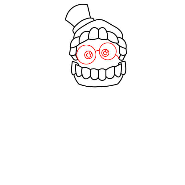 Uvnitř prostoru vytvořeného zuby nakreslete dvě velké kruhové ochranné brýle s můstkem. Uvnitř každých brýlí nakreslete menší kruh pro oční bulvy a ujistěte se, že vypadají velké a trochu bláznivě.