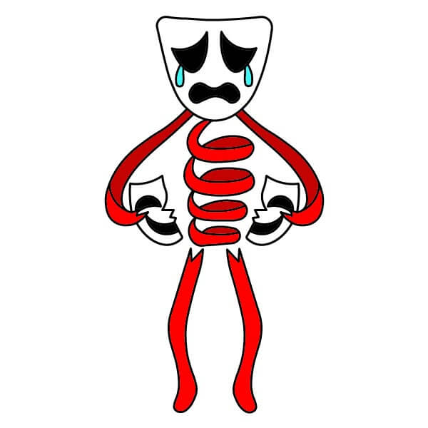 Vybarvěte všechny části stuhy – spirálové tělo, paže a nohy – jasně červeně. Hlavní masku nechte na hlavě a rozbité kusy masky v rukou bíle. Obrysy očí a úst masky vybarvěte černě. Slzu na masce vybarvěte světle modře.