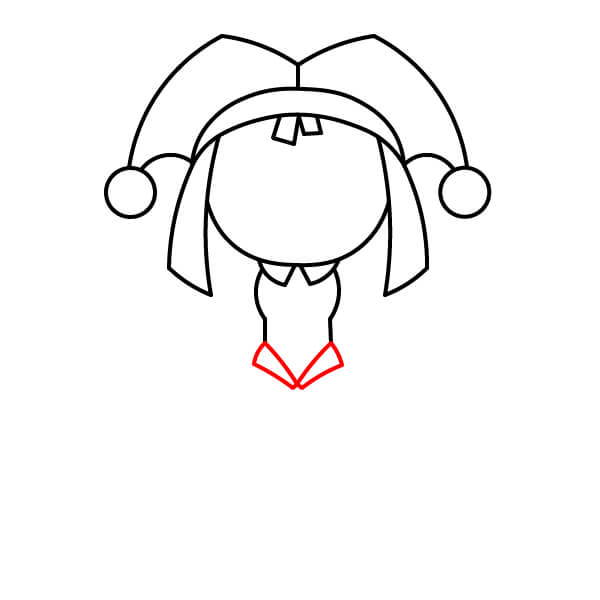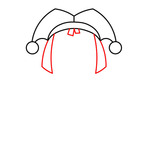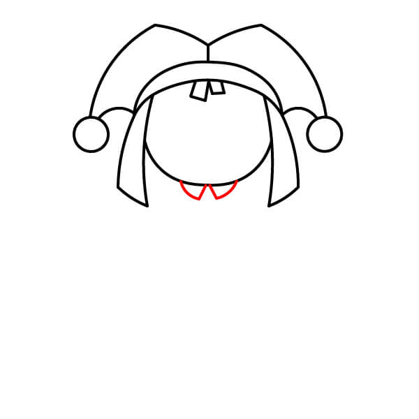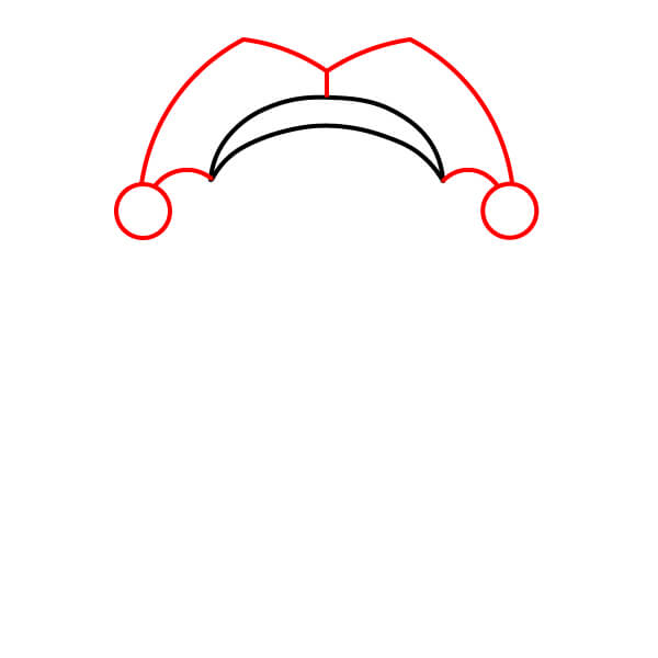 Nakreslete horní část klaunské čepice, která se skládá ze dvou špičatých zakřivených klop vyčnívajících z pásku. Na konec každé klopy přidejte kruh nebo zvonek.