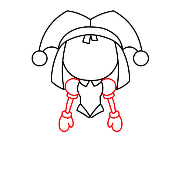 Nakreslete nadýchané rukávy, zaoblené v ramenou. Z rukávů prodlužte štíhlé paže, končící manžetami a velkými kulatými rukavicemi na ruce.