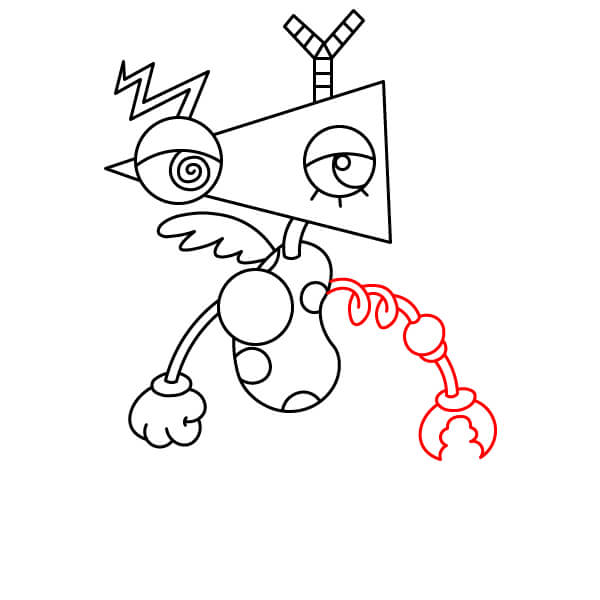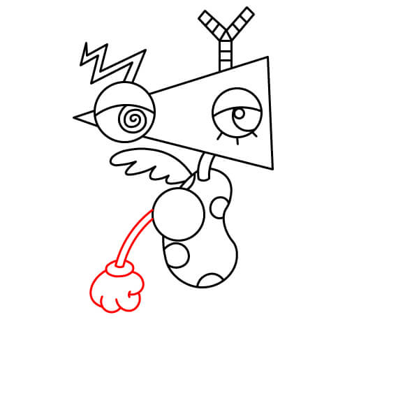 Nakreslete levou nohu (napravo od diváka). Tato noha má složitější tvar: vlnitý, stužkovitý tvar sahající od spodní části trupu, připevněný ke kulovému kloubu a končící spirálovou nohou.