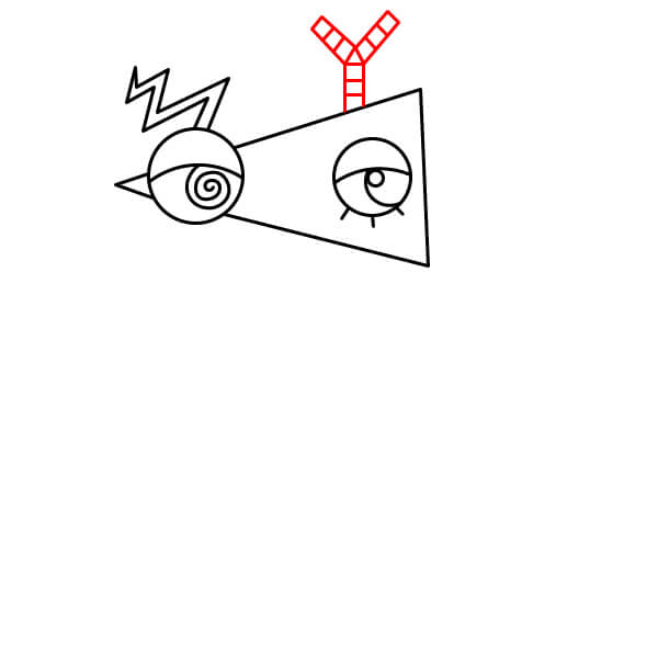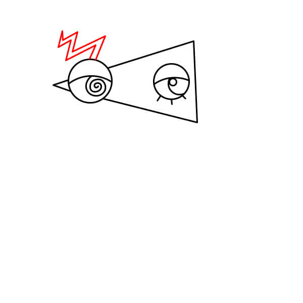 Nad prvním okem nakreslete klikatý nebo bleskový tvar směřující nahoru, který představuje část vlasů nebo strukturu hlavy.