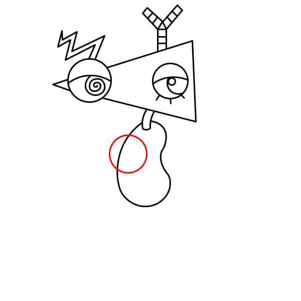 Nakreslete první segment těla pod hlavu. Je to velký, asymetrický tvar, jako fazole nebo ledvina, připevněný k hlavě malou trubicí.