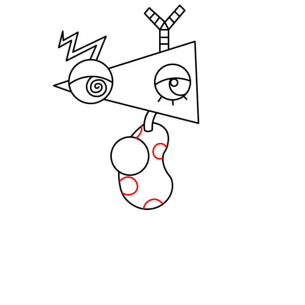 Vybarvěte hlavní kuželovitou hlavu růžovo/fialově a její tykadla černobíle. Spirálovité oko obrysujte fialově a spirálu žlutě, zatímco druhé oko zůstává převážně černobílé. Vybarvěte jednotlivé končetiny samostatně: velké tělo ve tvaru fazole je hnědo/oranžové s růžovými puntíky a modrými zaoblenými klouby. Paže, na které se dřepe, je oranžová se žlutými rukavicemi a paže, na které se drží stroj, má červené a růžovo-fialové segmenty s červenými drápy. Nohy mají také výrazný kontrast: vlnitá, kudrnatá noha je tyrkysově/modrá s fialovými klouby a světle hnědými chodidly, zatímco jednodušší noha s botami je celá modrá.