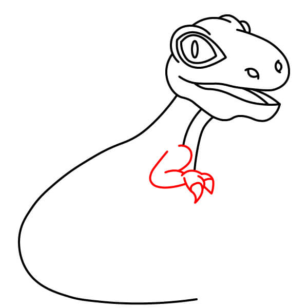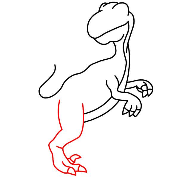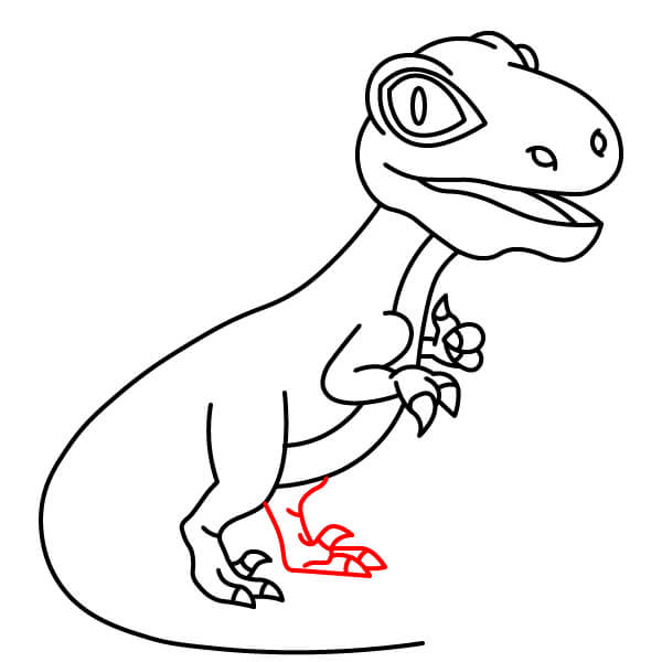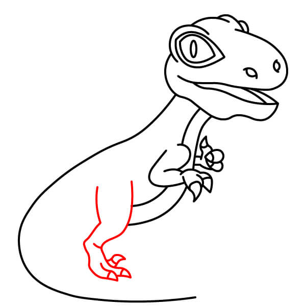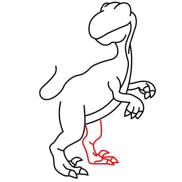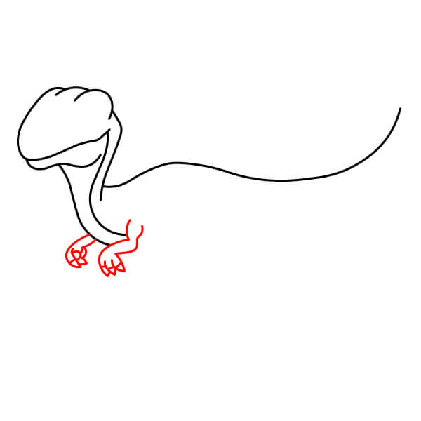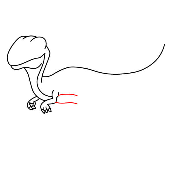 Nyní nakreslete dlouhou křivku pro první nohu a chodidlo dinosaura. Na konec přidejte dva špičaté drápy.