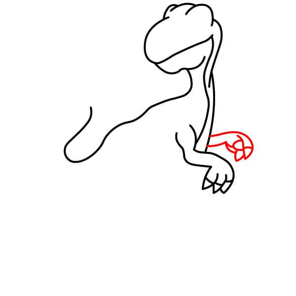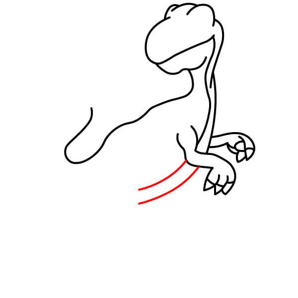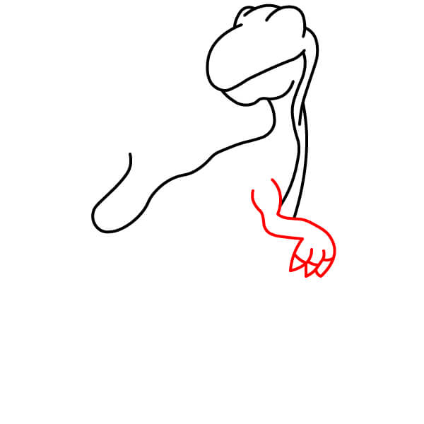 Nakreslete velkou křivku pro levou nohu a chodidlo dinosaura. Dole přidejte tři ostré drápy.