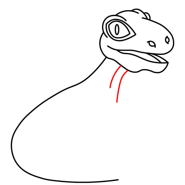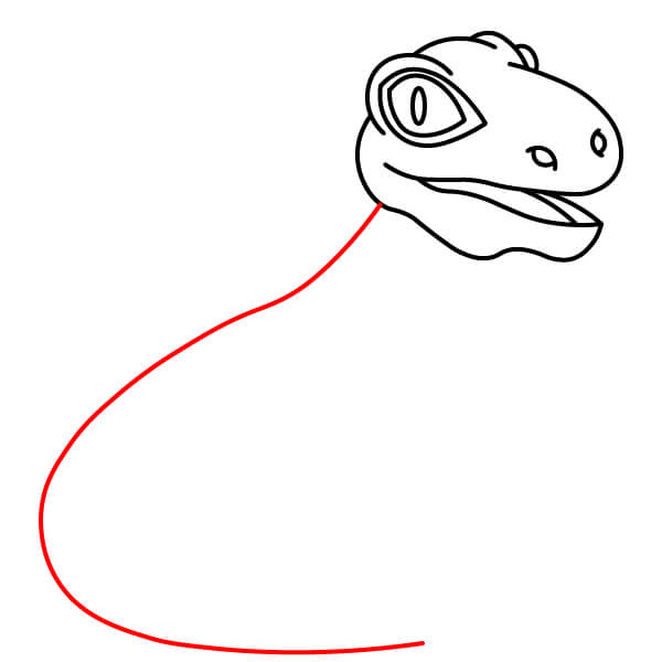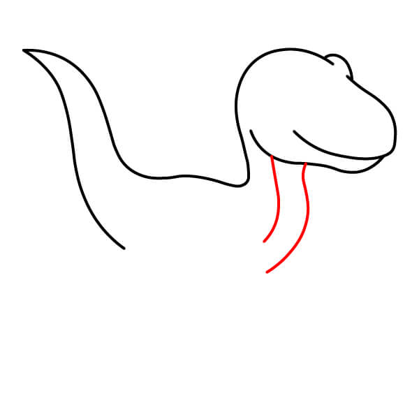 Ze zadní části hlavy nakreslete dlouhou zakřivenou čáru, která se zakřivuje dolů a poté se narovnává. To budou dinosauří hřbet a ocas.